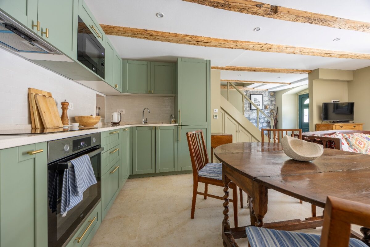 - Kitchen: Modern custom kitchen with oven, stove, fridge-freezer, microwave, and dishwasher