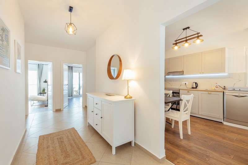 The apartment features a spacious internal area of 83 m² and a 10 m² terrace, perfect for enjoying the panoramic bay views. It includes a fully equipped modern kitchen, a bright open-plan living area, two comfortable bedrooms, and a bathroom.