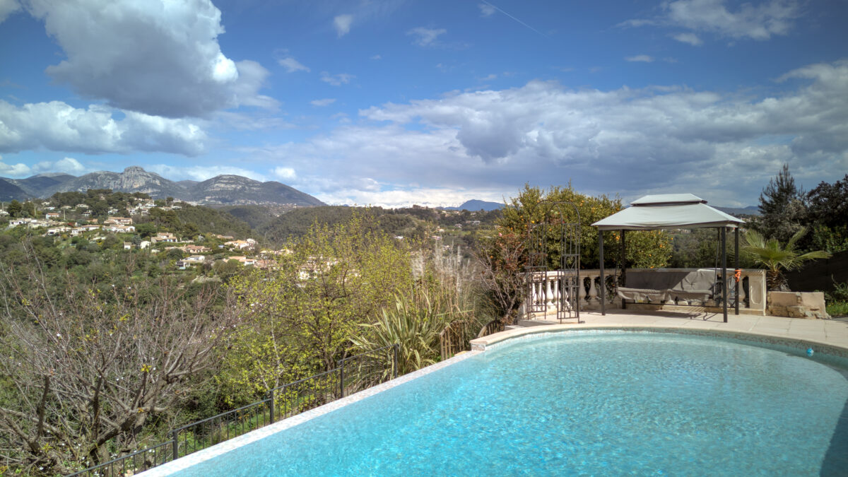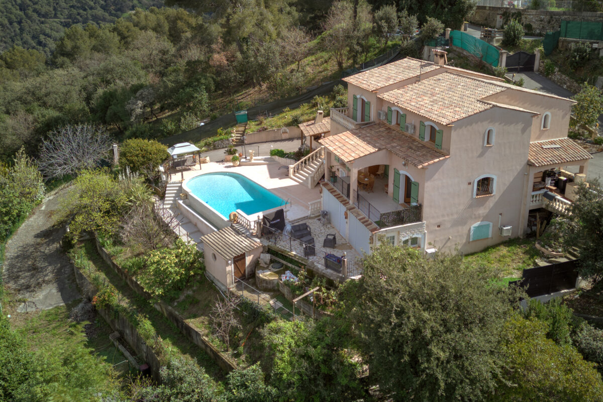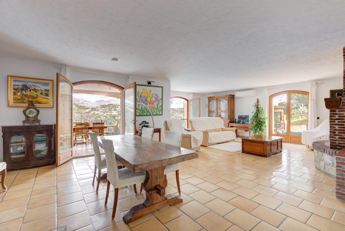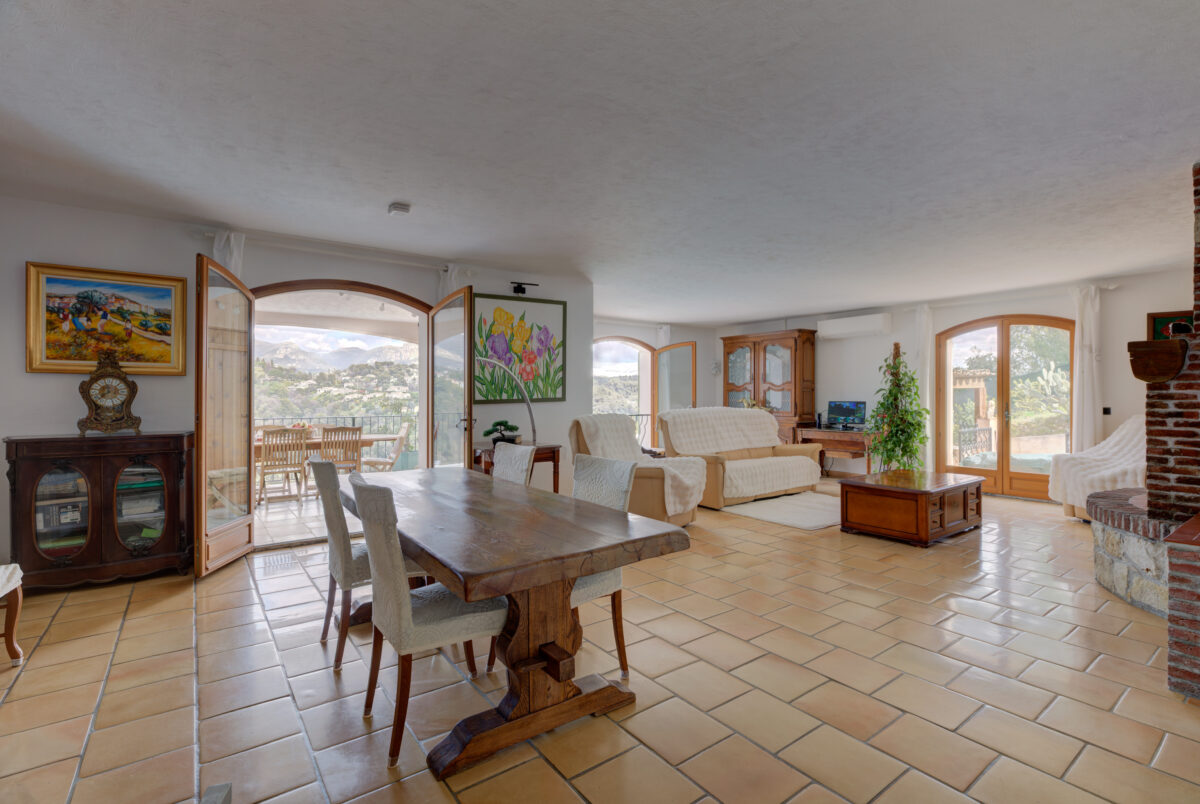 Nestled in the preserved natural setting of Saint-Paul-de-Vence, within the sought-after residential area of Les Espinets, this exceptional family villa offers 294 sqm of living space spread over three levels, with breathtaking panoramic views of the surrounding hills, greenery, and the historic village.