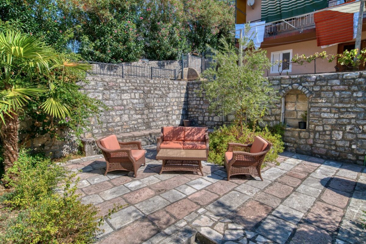 The garden, framed by greenery, provides a tranquil setting for relaxation or dining outdoors. With its outstanding position and enduring architectural style, this villa is a rare opportunity to own an exceptional home on the Montenegrin coast.
