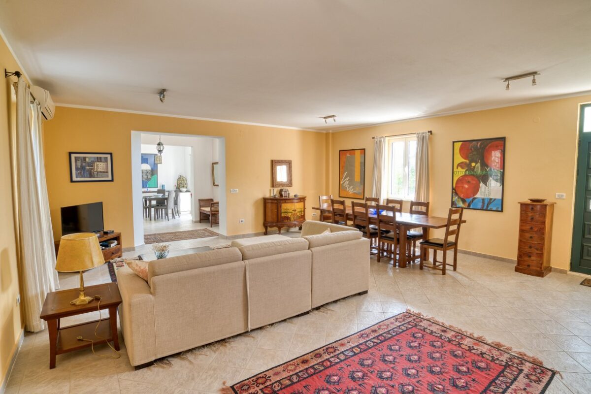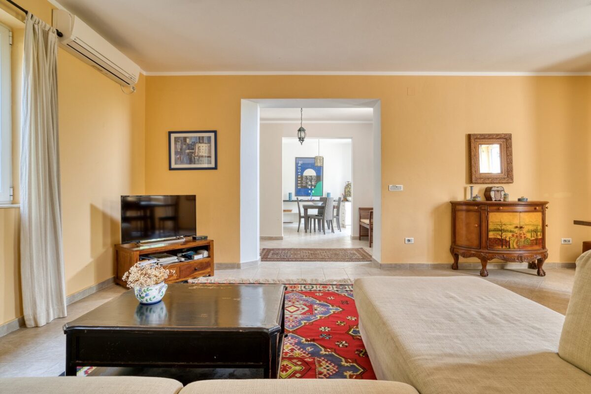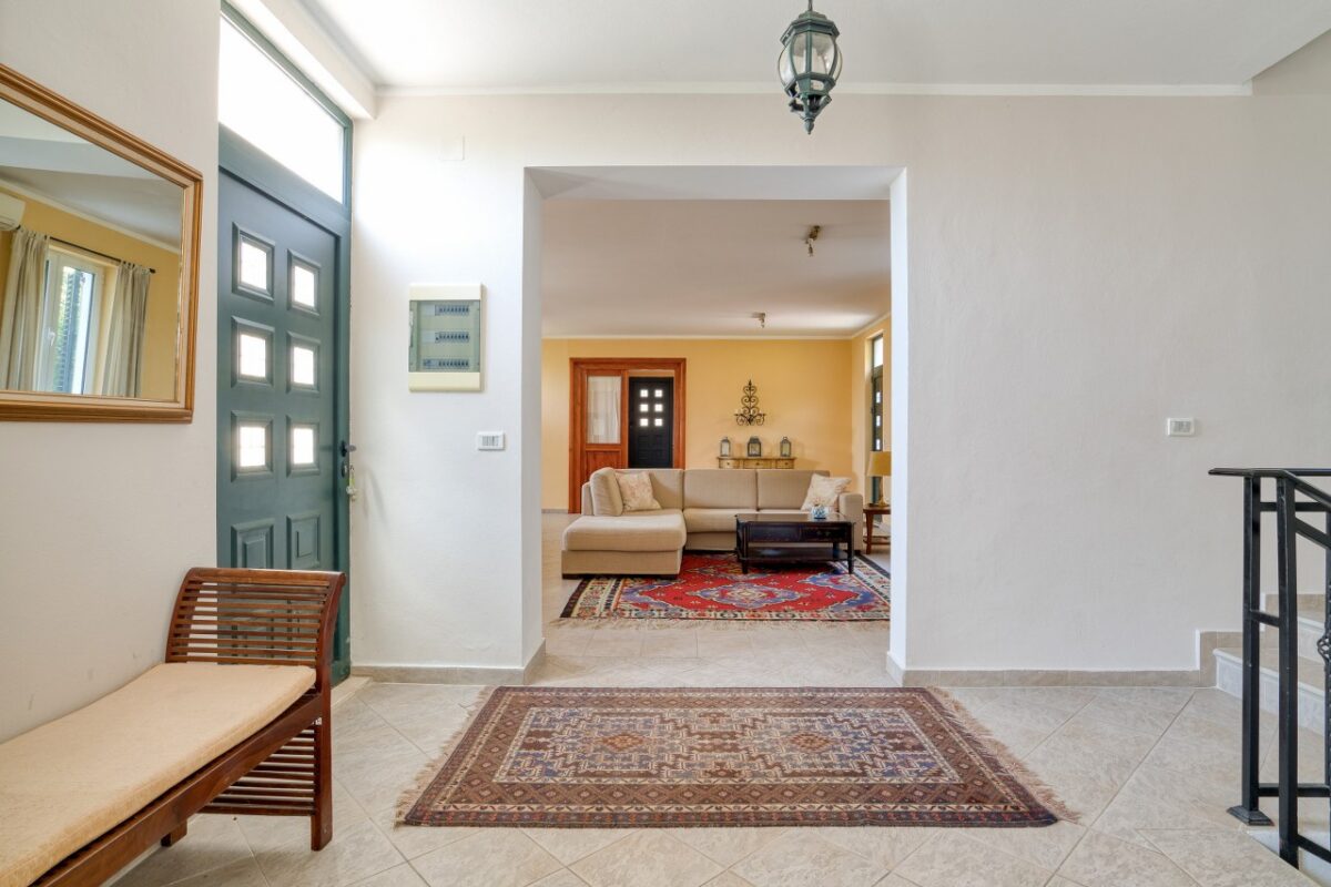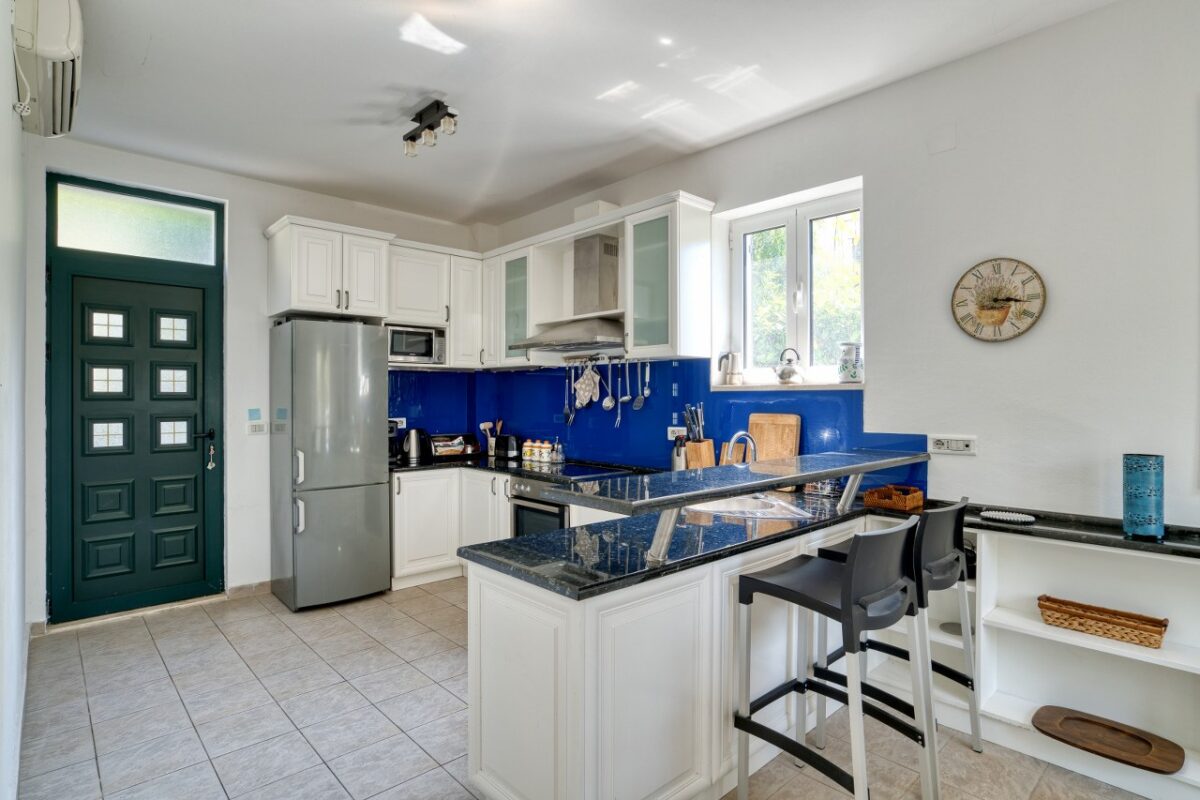 The villa includes four generously sized bedrooms, four contemporary bathrooms, and a guest toilet, ensuring comfort and privacy for both family and visitors. A bright living room opens onto a terrace overlooking the sea, seamlessly connecting indoor and outdoor spaces. The fully equipped kitchen with dining area is ideal for everyday living as well as entertaining.