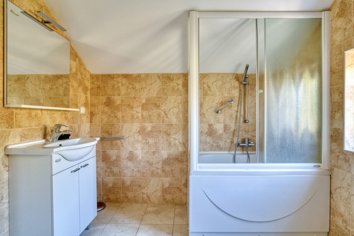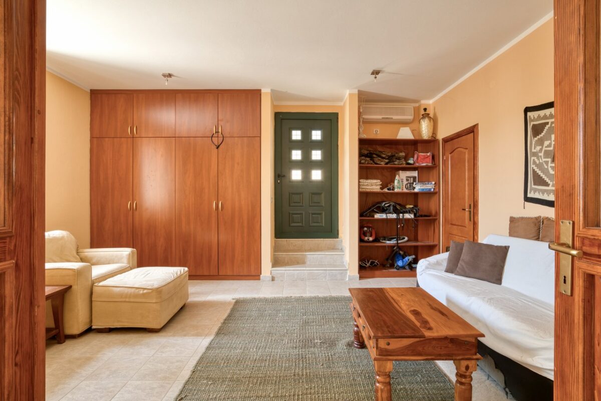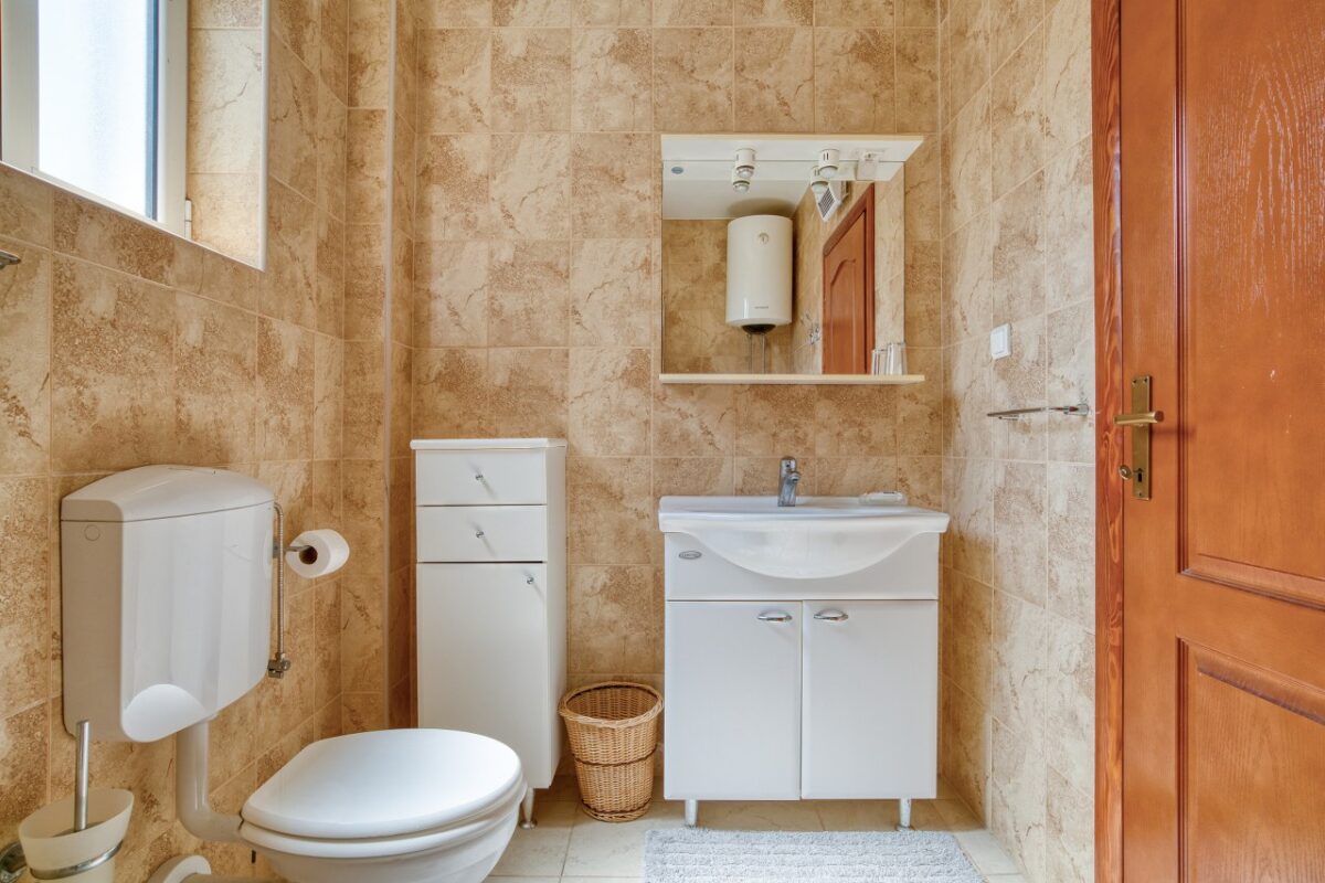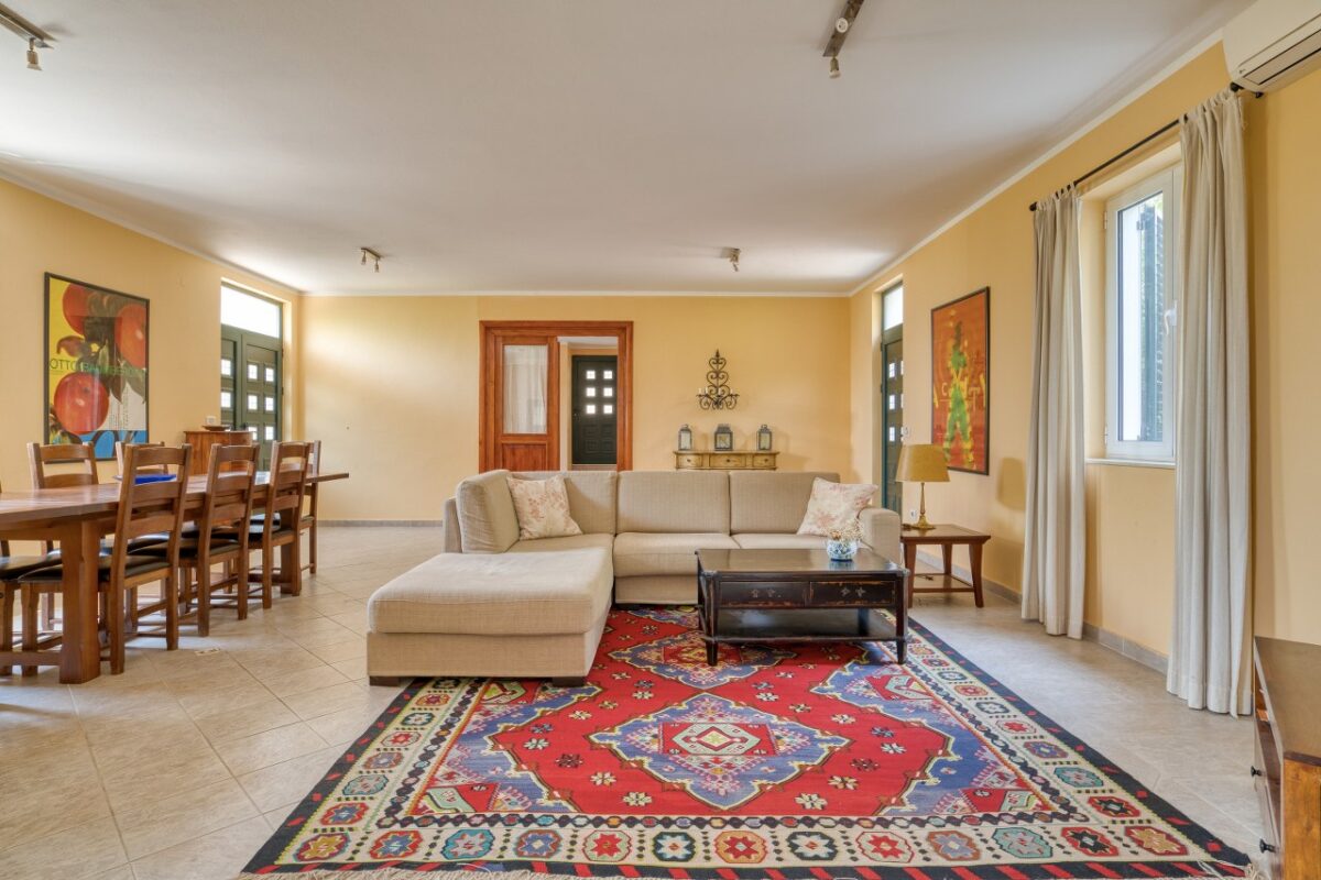 The villa includes four generously sized bedrooms, four contemporary bathrooms, and a guest toilet, ensuring comfort and privacy for both family and visitors. A bright living room opens onto a terrace overlooking the sea, seamlessly connecting indoor and outdoor spaces. The fully equipped kitchen with dining area is ideal for everyday living as well as entertaining.